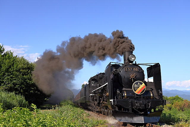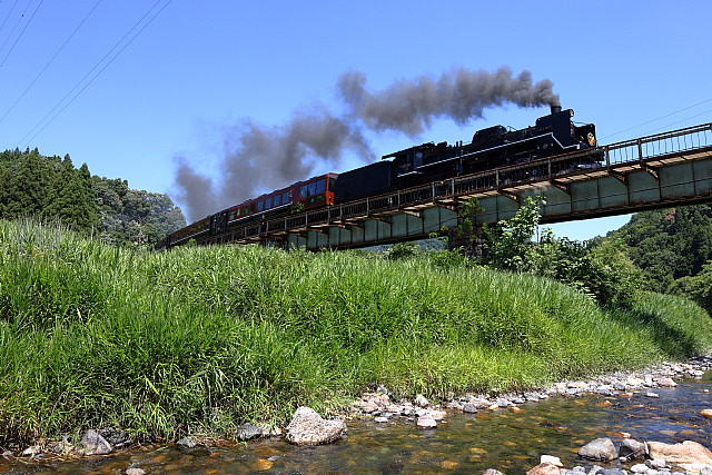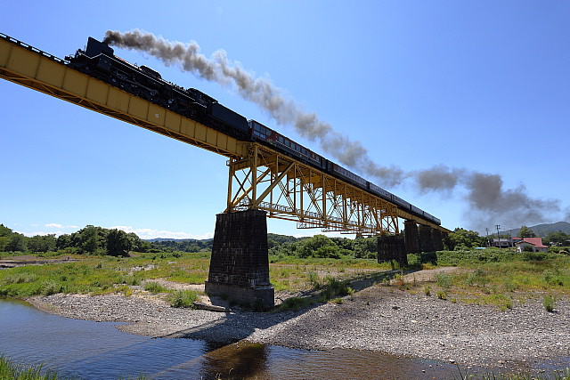 ◇「SLばんえつ物語」は夏の青空を背景に五十母川橋梁を煙を上げて駆け抜けて行きます。 五十母川のせせらぎを聞きながらの撮影ですが夏の日差しの照り付ける暑い暑い河原でした。 |