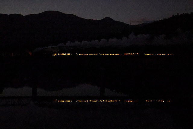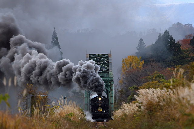 | ◇深戸橋梁を走り抜ける「SLばんえつ物語」を秋の風景とともに正面から撮影します。 この日は橋梁を吹き抜ける風が強く煙が横に流されることを予想して横位置カットで切り取ってみました。 |