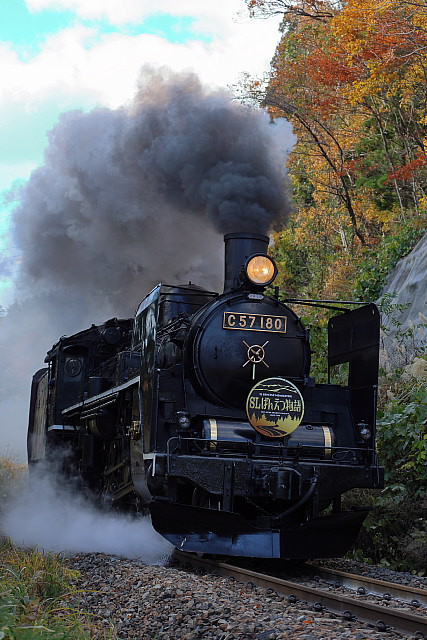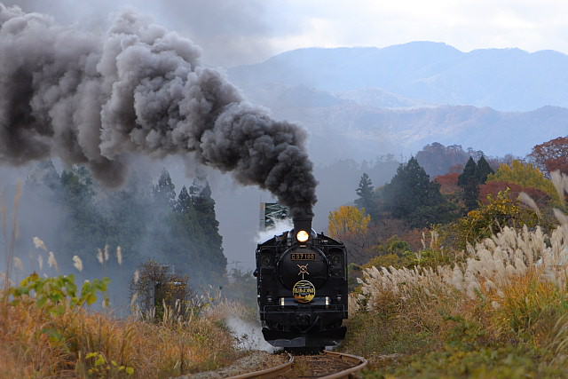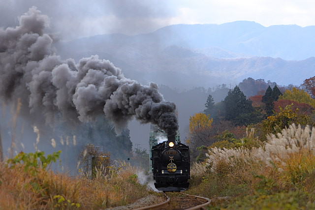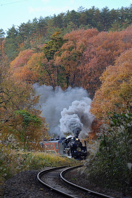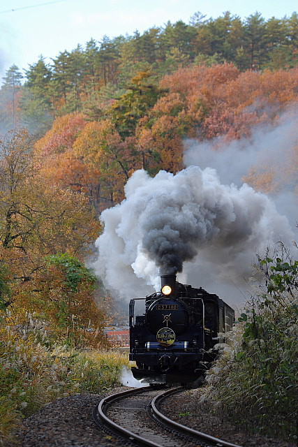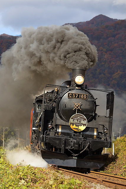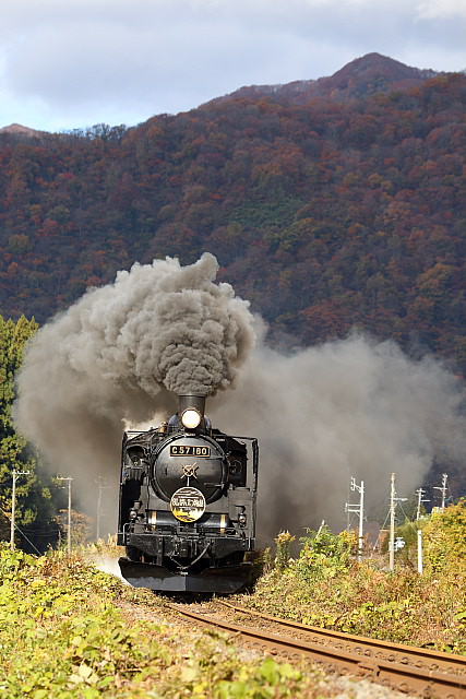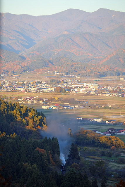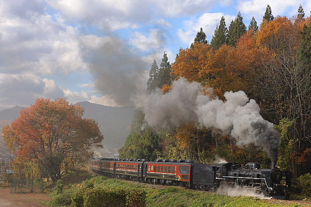 | 秋の磐越西線に「SLばんえつ物語」の撮影に2日間出掛けて来ました。2日間ともほぼ晴天に恵まれましたが、初日は風が強く雲が多く通過直前に紅葉の山々が陰ってしまうなどちょっと残念な撮影となりましたが、翌日は終日晴天に恵まれ紅葉彩る磐越西線を楽しむことができました。先週9日の川吉の空転トラブルの影響で会津若松行きがディーゼル機関車(DE10)が最後尾に連結されていました。 |
