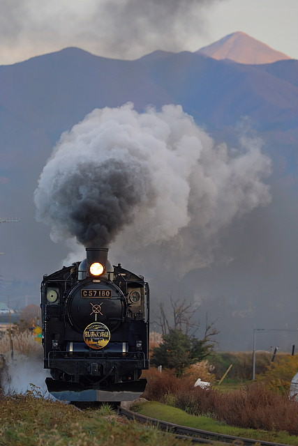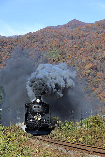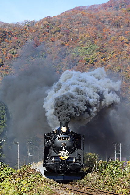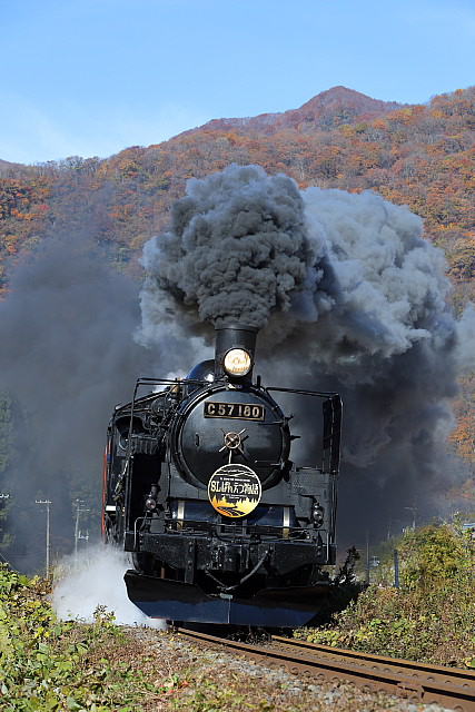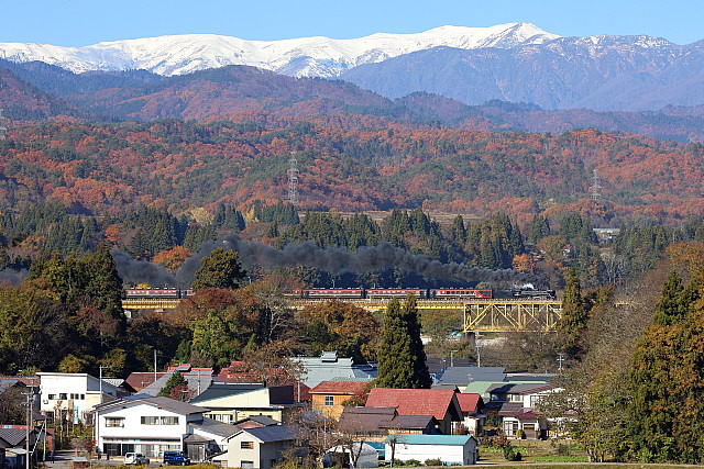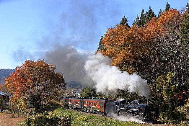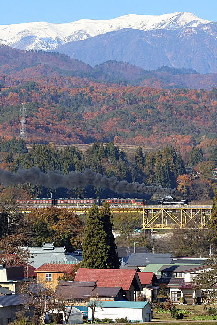 | 秋の磐越西線に「SLばんえつ物語」の撮影に2日間出掛けて来ました。2日間ともほぼ晴天に恵まれましたが、初日は風が強く雲が多く通過直前に紅葉の山々が陰ってしまうなどちょっと残念な撮影となりましたが、翌日は終日晴天に恵まれ紅葉彩る磐越西線を楽しむことができました。先週9日の川吉の空転トラブルの影響で会津若松行きがディーゼル機関車(DE10)が最後尾に連結されていました。 |