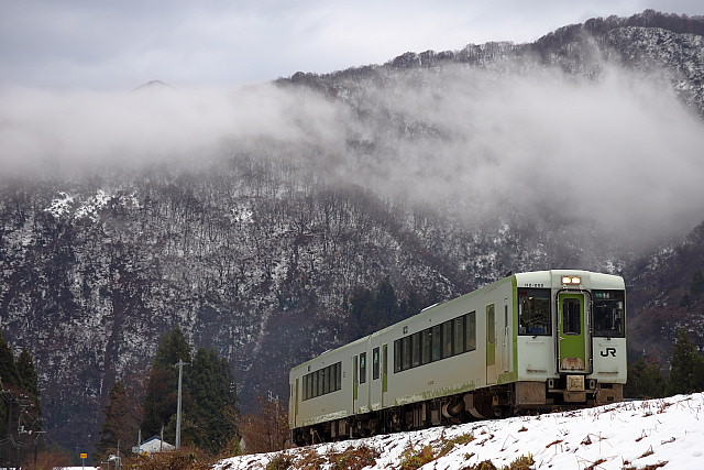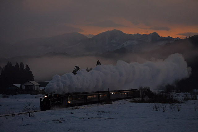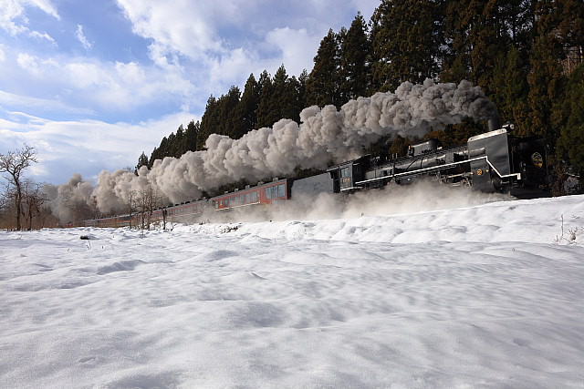 | 今シーズンラストランを迎えた磐越西線に「SLばんえつ物語」の撮影に出掛けて来ました。沿線は前日に降った雪が積もり12月に入ったばかりにも関わらず雪風景の中での撮影となりました。初日はほぼ晴天に恵まれましたが、翌日は目まぐるしく変わる不安定な天候の中での撮影となってしまいましたが、思いもよらない雪景色で雪風景を走る「SLばんえつ物語」を撮影することができました。この日も11月に発生した川吉の空転トラブルの影響で会津若松行きがディーゼル機関車(DE10)が最後尾に連結されていました。 |