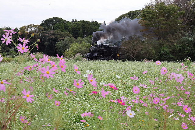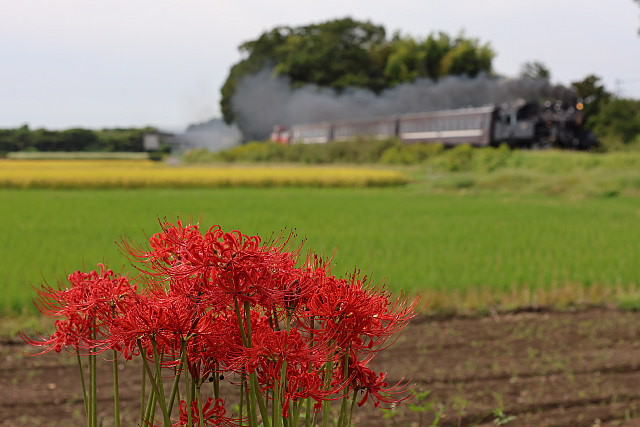 ◇彼岸花を前景にして八木岡築堤を走り抜ける「SL感動体験列車」を切り取ります。 同列車は返し真岡止まりのため最後尾にDL付きますが期待しなかった煙を上げての登場です。 |