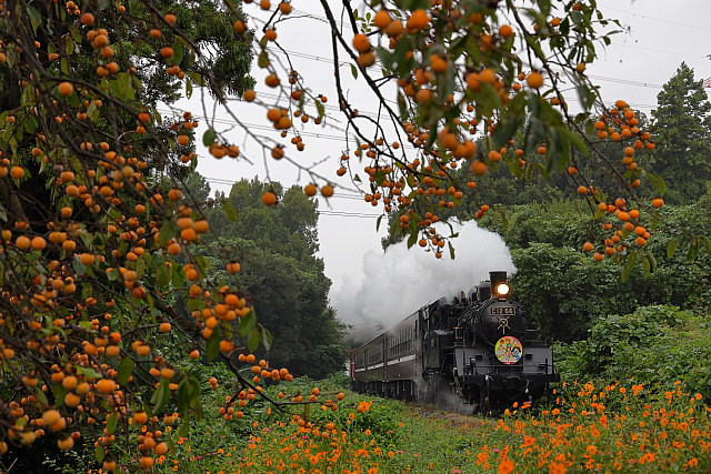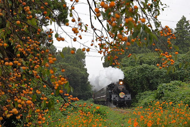 | ◇たわわに実った豆柿の窓を白煙を上げた「SLもおか」が走り抜けて行きます。 線路際に咲くキバナコスモスが秋深まる沿線をさらに彩ってくれます。 |
