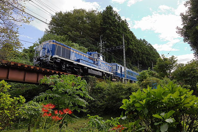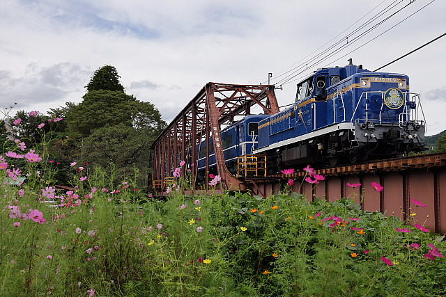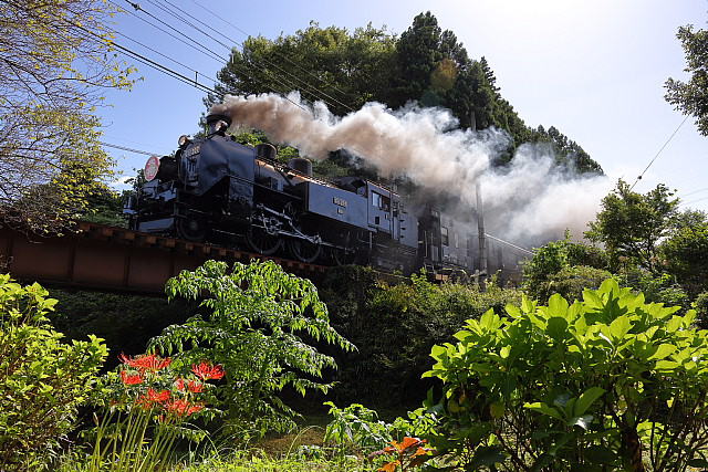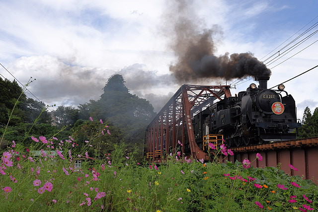 猛暑日がおさまりようやく秋の気配が出てきた東武鬼怒川線へ「SL大樹」の撮影に出掛けて来ました。この日は砥川橋梁に咲く彼岸花とコスモスを「SL大樹」と絡めて撮影してきました。残念ながら午後から曇りと天気となり季節の花も映えず、煙を弱々しく絵になりませんでした。この日の「SL大樹」のヘッドマークはもみじカラー掲出でした。 |