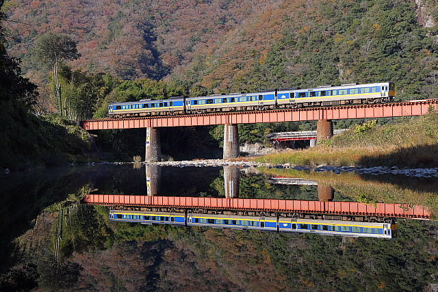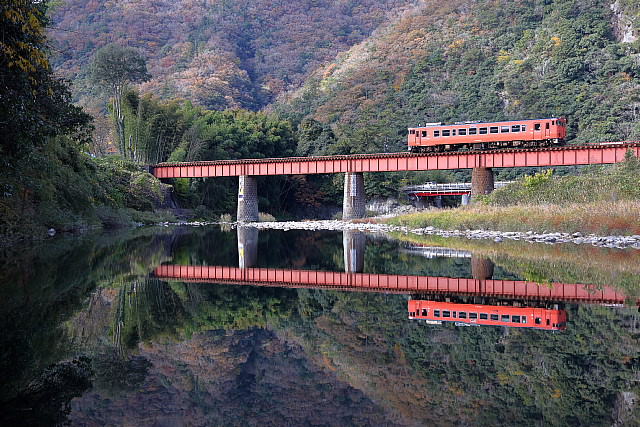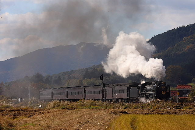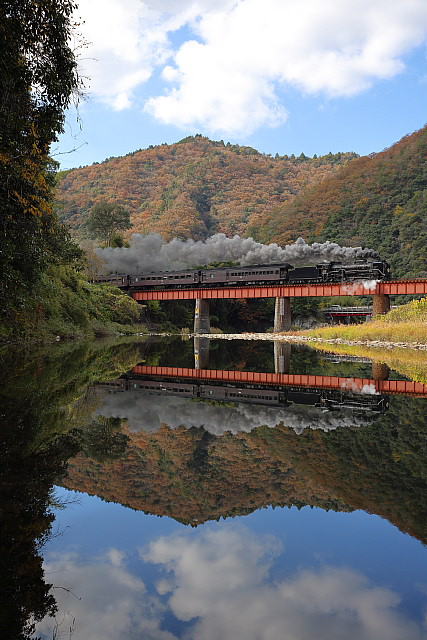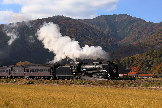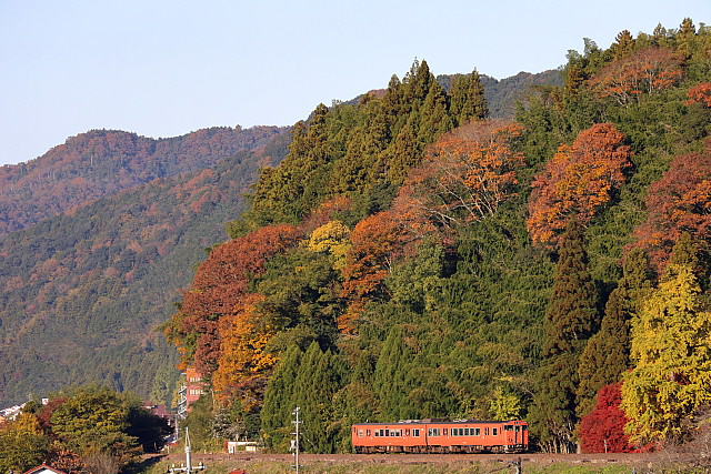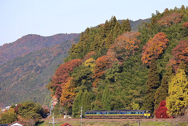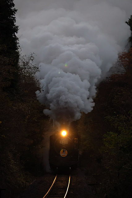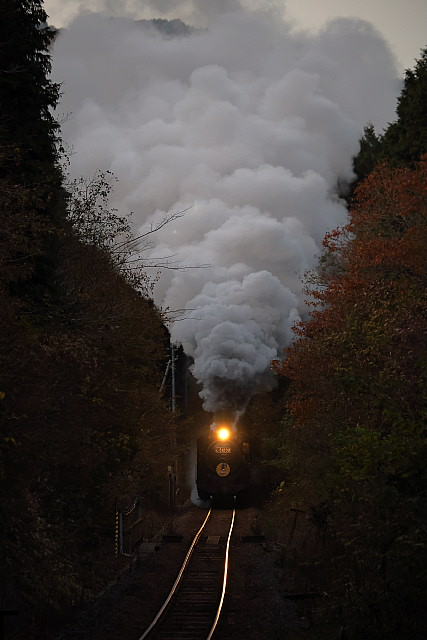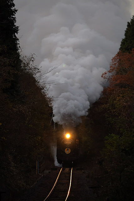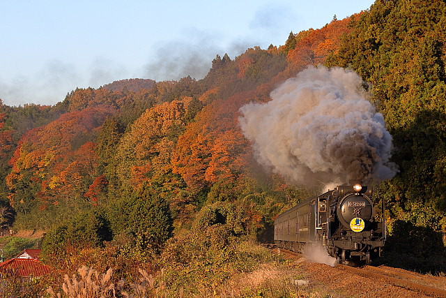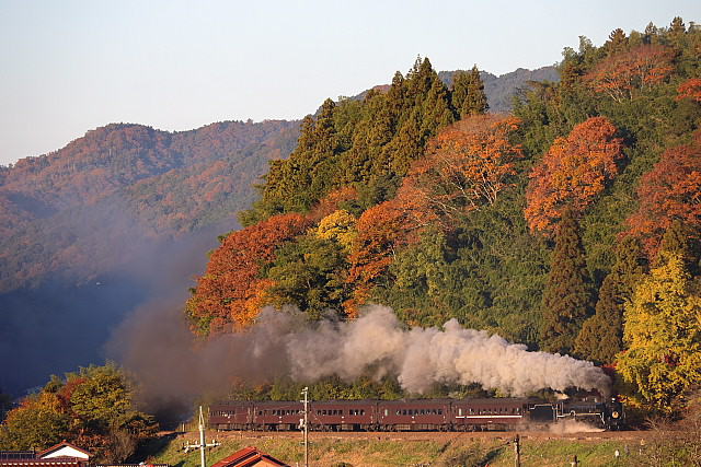 | 紅葉の季節を迎えた山口線に「SLやまぐち号」の撮影に出掛けて来ました。沿線の山々は色付きはじめ紅葉の風景が広がっていましたが、やはり温暖化の影響でしょうか紅葉の山々がきれいに彩る長門峡などでは紅葉する前に落葉してしまったのでしょうか冬枯れの木々が少し目立っていました。返し津和野駅発車時間が16路12分発と遅くなった「SLやまぐち」がこの時期に西日浴びて走ることができる区間の津和野盆地の山斜面では彩りはじめた紅葉の木々に西日が当たりさらに茜色に染まっていました。 |