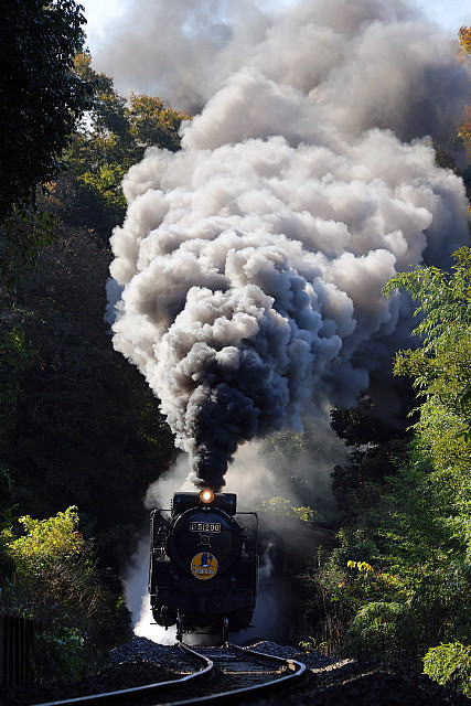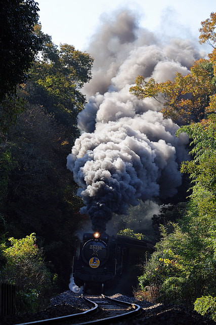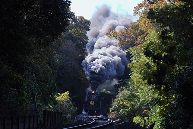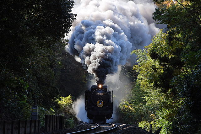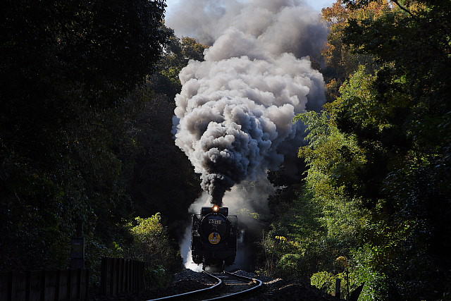 | ◇林に囲まれた切り通しを驀進する「SLやまぐち号」を 人気ポイント「18.6ポスト」先のSカーブする「18.8キロポスト」から切り取ってみました。 遮光する木々の隙間から日光が差し噴き上がる煙をよい具合に照らしてくれます。 |