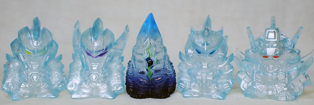 「SSSS.GRIDMAN」第10話に登場した新条アカネが最後に作った怪獣ナナシAの中から出できた怪獣ナナシBの完全新規造形の指人形とこれまで発売されているグリッドマン関連の指人形4種のLISTLESSカラー(クリアスカイブルー成型でシルバーを吹いたもの)の5体セットになっています。