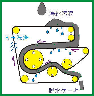 2枚の布の間で汚泥の水分を絞るように除去していくシステムです。濃縮汚泥に凝集剤を加え、脱水機のローラーの間を通って行くうちに水分が除去されていきます。