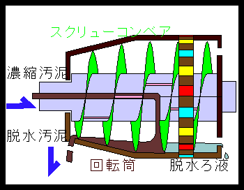 高速回転する回転筒のなかで2000g程度の力により水分を分離します。濃縮汚泥に凝集剤を加え、脱水機の中で遠心分離され脱水ケーキはスクリューコンベアによりかきだされます。