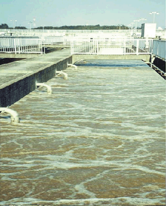 生物反応槽は活性汚泥法の中心となる施設です。活性汚泥が下水中の有機物を吸着、摂取、分解するところです。 池の底でくし状に並んだものが見えますが、これは熱帯魚の水槽のぶくぶくのようにセラミックの筒から空気を出す装置です。散気装置といいます。 人口一人当たり一日35gの有機物を処理するため、1立方メートル程度の空気が吹き込まれています。 一人当たり容量 80リットル 滞留時間 約8時間 汚れの変化(最終沈殿池と合わせて)