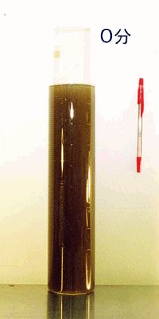 ガラス容器(メスシリンダー)に1リットルの反応槽混合液(返送汚泥と下水が混ざったもの)を入れます。その深さは33cm程度。比較のためにボールペンが横にあります。 そのまま置いておくと活性汚泥がみそ汁のように沈んでいきます。30分も経過すると沢山の上澄みができるのがわかります。活性汚泥の沈澱速度の速いことが返送汚泥による高濃度の微生物保持につながり、活性汚泥法の開発に至りました。 各時点の活性汚泥の状態を写真でお見せします。