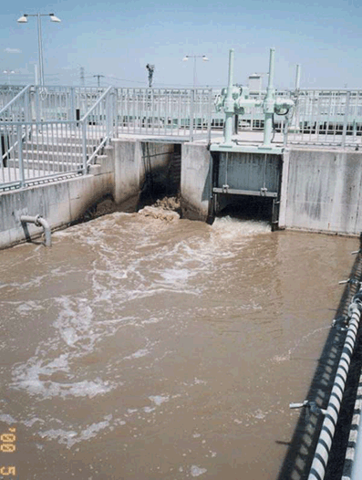 生物反応槽では大量の活性汚泥が水中の有機物を餌にして活動し、増殖します。 この写真は反応槽に下水と返送汚泥という微生物を多量に含む泥が流れ込んでいるところです。 左側が返送汚泥で茶色です。右側が最初沈殿池からの下水です。返送汚泥は下水1に対して通常25%の量送られますが運転の状況により100%くらいまで変わります。 このように沢山の微生物が働けるように返送汚泥が加えられ、生物反応槽では固形物にして0.2%くらいの汚泥濃度が保持されています。 空の池では左側に空気を吹き込む散気装置と配管が見えています。