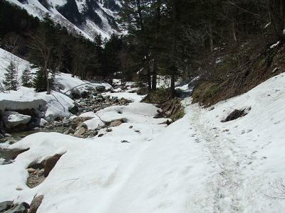 前日はものすごい雪だった上高地も、だいぶ雪が解けていた。大勢