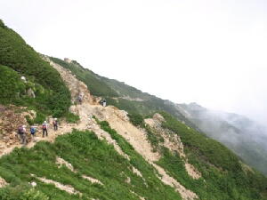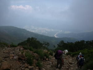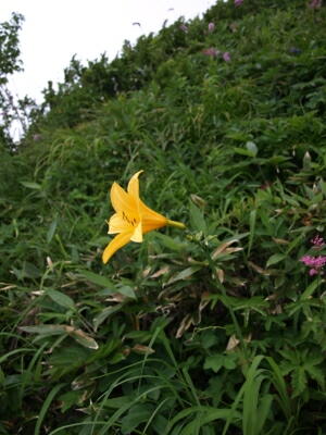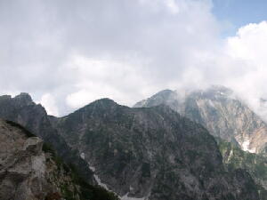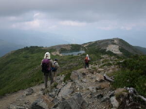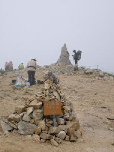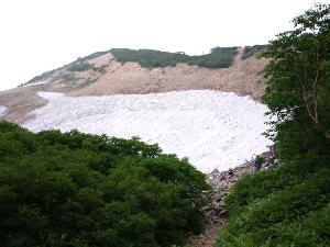 先にも書いたとおり、小富士の風はまだ冷たい。けれども日差しのせいでややポカポカと感じる。見晴らしもいいし、 お昼も近いし。ここらで食事にしよう。・・・・・・コンビニおにぎりですが。それがなにか? モソモソと梅干をかじりながらのんびりしていると、20人ほどのかつては若かった団体がやってきた。・・・・・・あ、すい ません一言余計でした。 そのかつては(中略)団体の方々は、若い男性の話を聞きながらあちこちと歩き回っている。どうやら五合目の山荘の 関係者らしい。あ、そういえば山小屋でガイドをしてるって話も聞いたことあるなぁ。 「秋になって紅葉の時期になると、ここからの富士山もきれいですよぉ〜」 ・・・・・・おぉっ!確かにきれいに映えそうだ。 よおし、またその時期になったら来よう! さぁて、おなかもいっぱいになったことだし、そろそろ幻の滝を見に行こうかな?