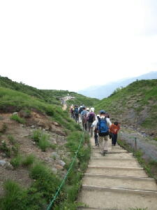 ・・・・・・・あれ?さっきの老夫婦はチョロチョロだったんですけど・・・・・・ 「あ、そりゃ上のほうに行かないと。僕は上流のほうに上がったけど、流れてき始めたのは10時半ごろだったなぁ」 ・・・・・・そうか、毎日雪が解けては夜中に凍っての繰り返しだから、上に行きゃ見られる時間も早くなるのか。 ・・・などと考えながら歩いていると、やがて周りは草地から砂地へ、砂地は岩場に変わり始め、だんだん轟々と水の 流れる音が近づいてきた。 ![]()