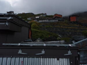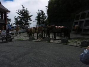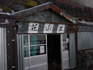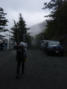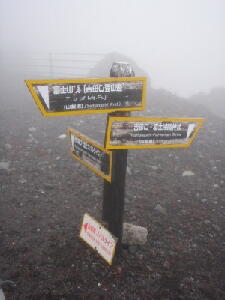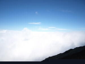 この後、さらに1時間近く登り続けた。 だんだん残雪の量は増えてきた。が、右から左にいっぱいいっぱいに広がる雪渓はまだまだ先のようだ。・・・・・・っ て、どんだけ上ればたどり着くんだ?! 周りを見てもあまり基準になりそうなものは見えない。ので、ちょっと右手、須走方面へ移ってみる。おそらく登山道は もうちょっと右に近づかなくては見えないだろうが、森林は見える。 確か須走登山道は、7合目辺りが森林限界だったような・・・・・・とすると、ボクが登った高さよりさらに上で森林が途 切れているということは、ボクのいる辺りはまだ6合目(・・・半?)あたりの高さなのだろう。 雪のすそ野はそれよりもっとずっと上に見える。あの辺りは・・・・・・8合目あたりだろうか? 登るうちに、雪渓から雪解け水が流れ出てくるところを見てみたいと思っていたのだが、ふと気づくと時計はいつの間 にか15時を指していた。 これ以上行っても、明るいうちに雪渓までたどり着くことは、まずないだろう。というより、そもそも明るいうちに下山し なくては!!