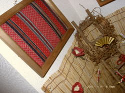 |  やっぱり正月は和風やね。 |  ストライプの生地は、つむぎ。 左のフレームの上にセットで かざってます。 | ||