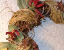 |  ステンシルなどを使って描いたツリー 最近は玄関だけをX’mas。 |  リース台にラフィアを巻きつけ、月桂樹と、とうがらしを 接着した簡単リース。星型の木の実でX’masっぽく。 | ||