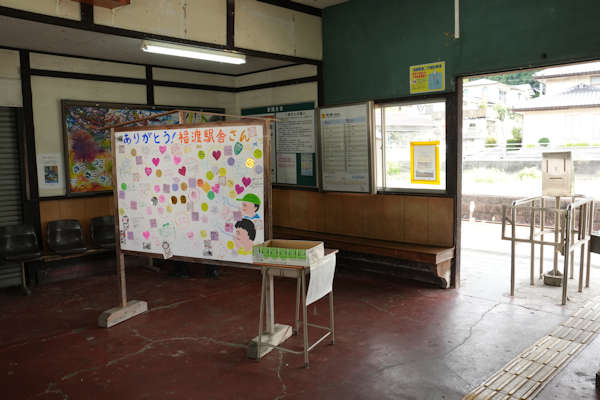 | 《コメント》 福渡は津山線の中間地点。 作者が生まれた頃は御津郡でしたが、2009年からの岡山市の政令指定都市化に先立ち、 2007年、岡山市北区に合併されました。 岡山市も広くなったものです。 周辺は役所支所や金融機関、病院など、津山線の沿線では比較的「町」となっていて、 午前中は福渡駅発着の列車も存在します。 かつては急行「砂丘」も停車していました。 明治時代(!)の中國鉄道開業にルーツを持つ明治42年建築(!!)とされる駅舎ですが、 ついに老朽化により取り壊し→簡易駅舎への改築が行われる事となり、 待合室内にはさよなら寄せ書きの掲示板も置かれていました。 この駅の改札口も、長い時代に渡って多くの人々の出会いと別れ、旅立ち… 様々な想い出が行き交う舞台となっていた筈です。 駅舎がなくなるのは残念ですが、今まで本当に「お疲れ様でした」と心の中で思いつつ シャッターを切りました。  |