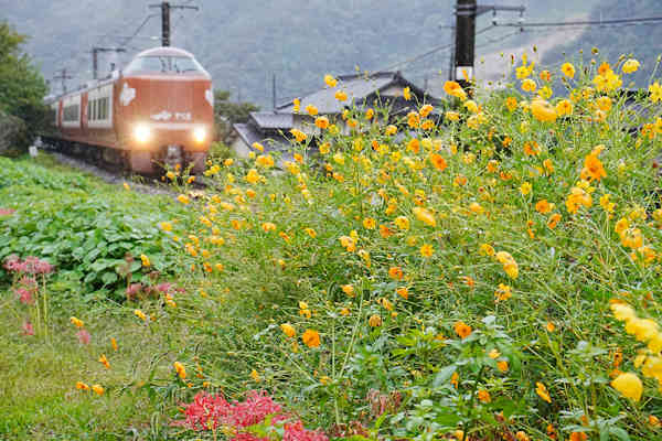 | 《アクセス》 これも上に同じ。 《光線・レンズ》 7時45分頃で85ミリ相当。小雨。 《コメント》 秋雨降る中、秋の花に囲まれて「やくも」が征く。 カメラ性能が飛躍的に上がって、このような写真がいとも簡単に撮れるようになった。 |