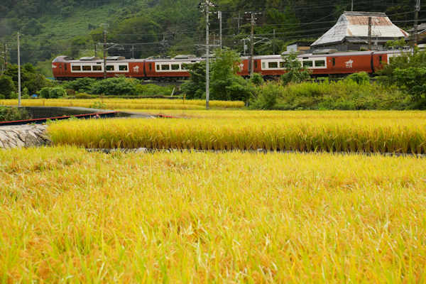 | 《アクセス》 上のカーブを線路南側の農道から見た。 《光線・レンズ》 7時半頃で100ミリ相当。 晴れていれば夕方の光線状態がおおむね良好。 《コメント》 この辺りは地形が緩やかに傾斜していて、「棚田」とまではいかないものの、 田んぼが段々に造られている。 今回は稲刈り目前の黄金稲穂の中で列車を撮ったが、 水鏡の時期なども美しいだろう。また再訪してみたい。 |
