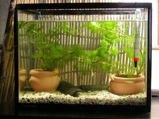 2003年9月30日、3週間ほど経ちますが、元気に泳いでいます。 いろいろ研究して、エビがコケや残ったエサを食べてくれる「掃除屋」だというので後から買いに行って入れたのですが、水草をちぎったり引っこ抜いたりと暴れまわります。ムカツク!水草が食べられたりして減ってしまったので、今は別の種類の水草を入れています。 メダカはほぼ毎日卵を産んでいます。卵は10日くらいで孵化するみたいです。今は別の瓶に卵を移していますが、毎日産むので追いつきません。最初に産んだ卵はもう生まれて小さなメダカが数匹います。親と一緒にすると食べられてしまいそうなのでまだ瓶の中です。最近は水槽をのぞいて癒されています。 水槽は家にあったもの。百均でスダレと小ツボと竹炭を買ってきました。 |