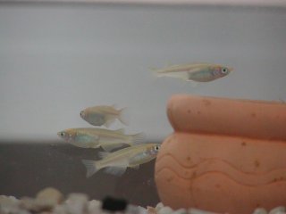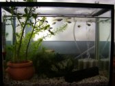 ![]() | 2004年5月19日、更新しないうちに卵が孵り、仔メダカがうじゃうじゃ増えました。プラケースに入れてたのですが人口密度が高くなったので専用に水槽を購入し、お引越しをしました。親よりいい住まいです。 |
