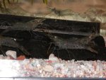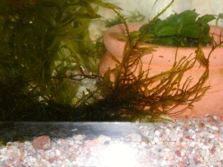 ![]() | 2003年11月25日、水温は10〜15度、冷たいのでじっとしていることが多い。エビはツボの中に潜り込んだまま全く出てこない。泳ぎ回っているとことを先週に目撃したので、まだ生きていると思われる。冬眠とかするのだろうか? |