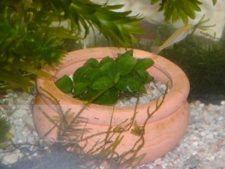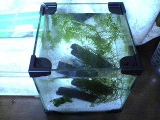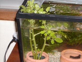 ![]() | 2004年3月4日、今日は寒さが戻り、雪も舞ってました。隣の駅にある熱帯魚店で新しい水草を買ってきて植えました。「アヌビアス・ナナ」(左)と「ウィローモス」(右)という種類の水草です。水草にはたくさん種類があって、水草だけを水槽に植えて楽しむ方法もあります。うちはメダカとエビがメインだけど、いろんな水草が欲しくなってしまいました。クレソンは茎からたくさん根っこを出しています。久々に水も入れ替えたし、しばらくいじらないようにしよう。 |