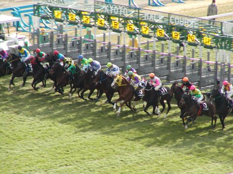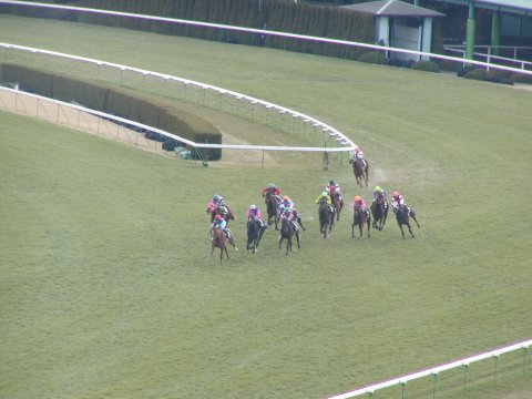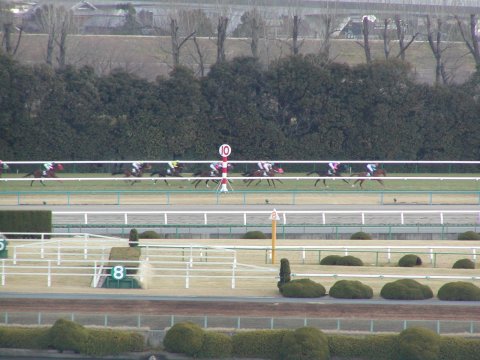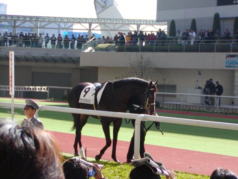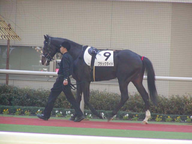 ![]() | ←新馬戦一番人気はこの「ブラックタイド」。パドックを見ても全員一致でこの馬が大本命!なにせ駄馬の中に1頭だけG1馬が混じっているような印象。 →見事1着でした。写真の腕が悪くてゴールからだいぶ手前でのシャッターとなりました。動く馬を撮影するのって難しいです。 ちなみに騎乗した武豊がHPの日記の中でこの馬を絶賛していました。→武豊のHP(http://take.nifty.com/) | ![]() |
