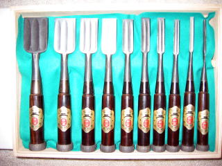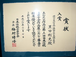 2002年度第五回日本伝統工芸士会作品展(沖縄大会)において播州三木打刃物の中で初入賞しました。 左上写真はその時の賞状で左下写真は入賞作品の追入鑿二枚三枚裏十五本組(黒丹柄付・桐箱入り)です。 |