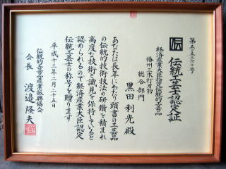左写真にもあるように三代目利光は、経済産業大臣認定で伝統的な古式鍛錬技法を日々、研鑽し高度な技術と識見を保持している人々に認められる伝統工芸士の一員です。 あまり知られておりませんが、三木市は、特に審査が厳しく年1回、それに了承された製品にのみ貼付できる伝統工芸品証紙(左下写真)です。 格式高い審査に合格しておりますので、皆様も三木の製品にこの伝統工芸品証紙が貼付してある製品を一度チェックしてみてもいいでしょうね。(まがい物は恥ずかしくて貼付できませんから) |