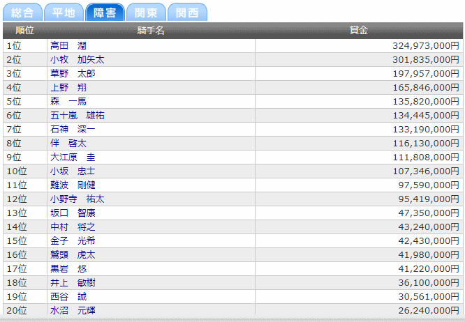 2025年 障害レース 獲得賞金 2025年10月14日 現在 |