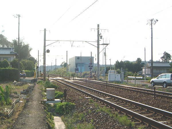秋常踏切越しに菊川方を見る。工場の横から上り線沿いに伸びているのが加速線跡で、