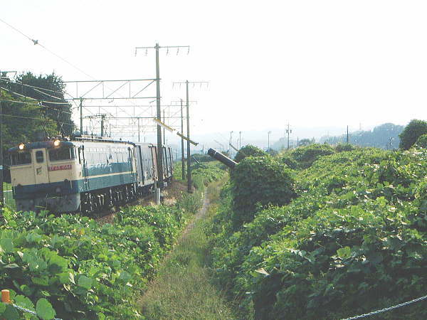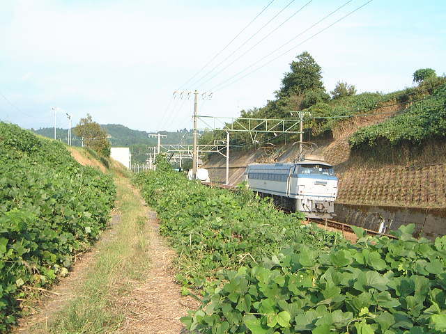 同じ場所の加速線跡の上。ちょうど上り貨物列車が通過中