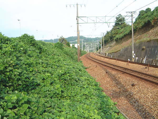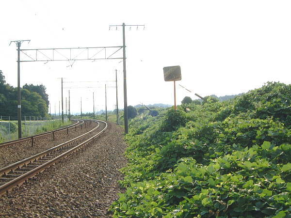 少し菊川方の線路際から。右カーブが始まるあたりから下り始めで、勾配票と