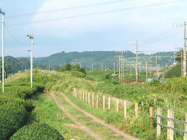 左側に立っている防霜ファンの奥の丘が加速線跡末端。周囲は一面の茶畑。