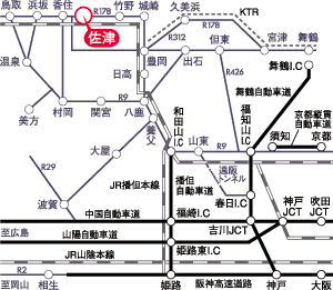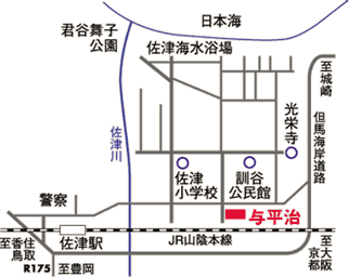 中国自動車道・福崎I.C.から播但有料道路を経由、R312豊岡よりR178にて佐津、与平治へ。