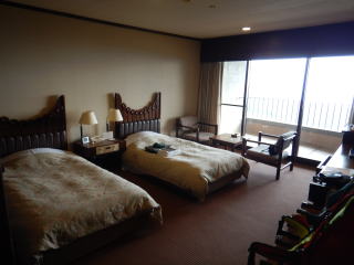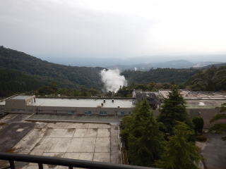 | 宿 前泊の指宿いわさきホテルからの直行バスがあり、鹿児島空港への直行バスもあって大変便利でした。部屋はパノラマツインで、広々としていて設備も良く、湯けむりの湧き上がる景色も風情がありました。翌日は晴れて、遠く開聞岳もうっすらと見えました。「お好みプラン」1泊2食付12,500円ですが、登山口までの送迎と弁当付で13,000円の「トレッキングプラン」もありました。 | |||