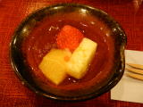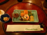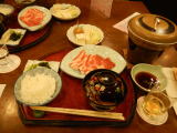 | 食 夕食は、初日は和風レストラン&バー「天降(あもり)」の和食会席を選びました。メニューがあって、食前酒(ホテル特製梅酒)、小鉢(鮪の山葵和え)、旬彩(車海老、鮭小袖寿し、諸子甘露煮、粟麩照焼、菜の花唐墨掛け、金柑、スナップエンドウ醤油浸し、烏賊三升漬)、御造里(盛り合せ)、焼物(銀鱈糀味噌漬など)、蒸し物(鰻小茶碗蒸し)、台の物(鹿児島黒豚しゃぶしゃぶ)、御飯、香の物、留椀(袱紗味噌仕立)、果物(季節物)でした。きびなごのお造りと黒豚しゃぶしゃぶは美味しかった!朝食は、洋風レストラン「イン・ザ・ツゥりーズ」でビュッフェです。 2日目の夕食は、洋風レストラン「イン・ザ・ツゥりーズ」の洋食フルコースを選びました。メニューは、アミューズ(マッシュルームのオーブン焼きニンニクバター風味)、オードブル(貝のマリネ燻製香り)、スープ(人参のスープ)、ポワソン(イトヨリ鯛のポワレたんぽぽ添え)、グラニテ(林檎のシャーベット)、ビアンド(リブロースステーキ温野菜添え)、デザート(人参芋のブリュレ)、パン、コーヒーでした。とても残念なことに、最初に頼んだ赤ワインが古くて味が変わっていました。そうなると、後の料理も今一つ楽しめなくなるものです。残念です。ちなみに、飲み物代金はサービスしてくれましたが? |