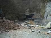 ![]() | 林道を登りきったところにある犬越路随道。トンネル入り口にはちょっとした広場があって流水が流れていました。トンネルの中は電気がないのでかなり暗く足元が確認できません。鋪装されているのでつまづく心配はまず無く、また直線のトンネルなので出口が見えるのが心強いですが、できるならライトを持っていくのがお勧め。 道路自体は西丹沢自然教室からここまでずっと鋪装されているので、この道が一般車両通行止なのは勿体無いのでは、と思っていたのですが・・・ |