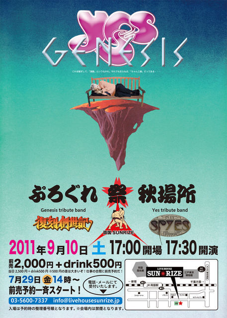 YES TRIBUTE BAND「SPYES(スパイズ)」と GENESIS TRIBUTE BAND「復刻創世記」の共演ライヴです。 2人のスティ-ヴ(ハケットとハウ)がそれぞれ参加したグル-プであるジェネシスとイエスのコピ-バンドを一挙に見れるという企画ですv(^^) [第1部] SPYES(スパイズ) 以前は確か「AZB48」というグル-プ名でしたが、心機一転グル-プ名を「SPYES(スパイズ)」にしての再スタ-トです。 ギタ-、ベ-ス、キ-ボ-ドのおじさんは金髪のロン毛ズラを被り、ちょっと引きたくなるような気がしないでもないですが(;^_^A前回見に行った時同様、素晴らしい演奏を聴かせてくれました。 下記のセットリストをご覧になればわかるとおり、限りなく『イエスソングス』の再現といったライヴでした。 それも、ご本家でも多分ライヴでは演奏されなかった?であろう「Five Per Cent for Nothing」も聴けてたのですから!