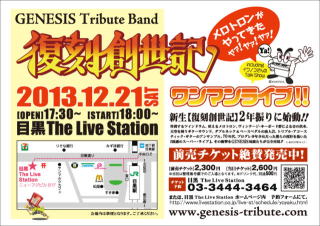 [第2部] 復刻創世記 前回のライヴから約1年半が経ち、Steve Hackett役の神蔵治氏は脱退し、Tony Banks役の馬渡知樹氏も「暫くの休養?」ということで、残るメンバ-がサポ-トを加えてのお披露目ライヴです。 勿論、ライヴにおいて手を抜かないところが彼らの凄いところ! 今回のライヴもテンション高く、また楽しい演出でした♪ キ-ボ-ドはPhil Collins & Peter Gabriel役の中島靖雄氏が何処かでスカウト?してきた実力者(女性キ-ボ-ド奏者)で、おそらくクラシックを聴いて育って来た方だと想像されます。 頭をリ-ゼントにし、一見怖そうなギタ-の方は、本人曰く「怖そうですが、本当は気さくなところがあるので話しかけて下さい。」とのこと(;^_^A 確かに、本物のハケット氏とは趣味も使うギタ-も違ってましたが(;^_^A「レスポ-ルでなくて本当にすみません」と会場の笑いを誘う気さくな方でした。 中島氏の話だと、蕨のハニフラの店長さんらしいです!