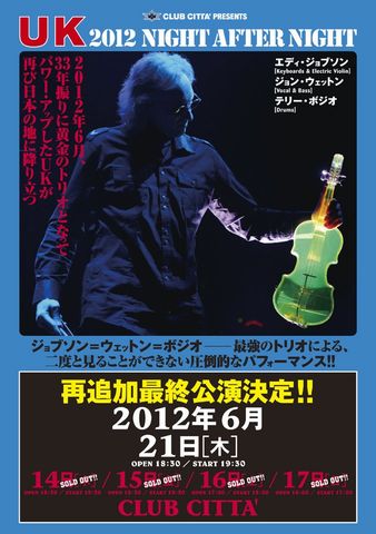 昨年、4人編成でReunionにより来日してくれたUKでしたが、こんなに早くポジオ君参加のトリオ編成で来日してくれるとは、思いもよりませんでした! ウェットンさんの話によると、「基本的にはこのUKはジョプソンのグル-プだし、僕にはエイジアがあるしね」ということで、一度限りの再編ツア-らしいですが、それにしても驚きました。 彼らにとって、70年代後半、イギリスやアメリカよりも日本のファンに多く支持を得られたというのも、大きな要因ではなかったのかとも想像できますが。 ウェットンさん ん~~~~~~~昨年の来日公演よりも更にお腹周りの肉付きがよくなったか?? メタボがちょっと心配にはなりましたが(;^_^Aまだまだ衰えを知らぬ声で頑張ってくれました。 ジョプソン君 すっかりオジサンとしての貫録がつきましたが、ウェットンさんとは違い、若い頃とほぼ変わらぬ体型を維持しているのはサスガ! キ-ボ-ドを弾いているのもそうですが、この人のバイオリンを弾く姿は本当に絵になります♪ 今回の来日公演での彼のソロコ-ナ-では、ソロアルバム『グリ-ンアルバム』から美味しい曲をチョイスしてくれて、これまた楽しませてくれました(^_^) テリ-・ポジオ君 彼のプレ-を観たのは実は私Yutak初めてなのですが、私が今まであまり見たことのないタイプのドラマ-でした! 良い言い方をすれば、「俺のドラミングはこうなんだ!」という自己主張が強い。 オジサンなのに何処かヤンチャ坊やみたい(;^_^A 世間一般では凄く高い評価を受けてるみたいですが、好き嫌いに個人差があるかなあ?と思わなくもないです(;^_^A 私が敬愛するス-パ-ドラマであるビル・ブラッフォ-ドさんとは徹底的にそのスタイルは違います。 でも、もう1つ良い言い方をすれば、ブラッフォ-ド在籍時のナンバ-をブラッフォ-ドのプレ-を意識することなく、自分のスタイルで叩いて、違和感なくファンに受け入れさせるところはサスガかな! この3人が揃って来日公演をしてくれることはもうないんだなあ!?と思うと凄く残念ですが、彼らの1979年初来日公演を観損なった私にとって、今回の再来日はとてもとても記憶に残るだろうものでした。