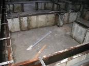 立ち上がりのコンクリート用の型が設置されています。ここは風呂場になるところです。真ん中に突き出ているのは、排水管です。飛び出た部分は後で切断されます。