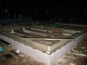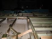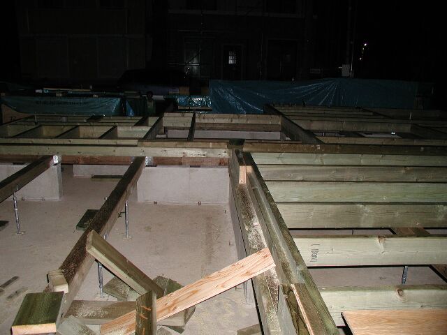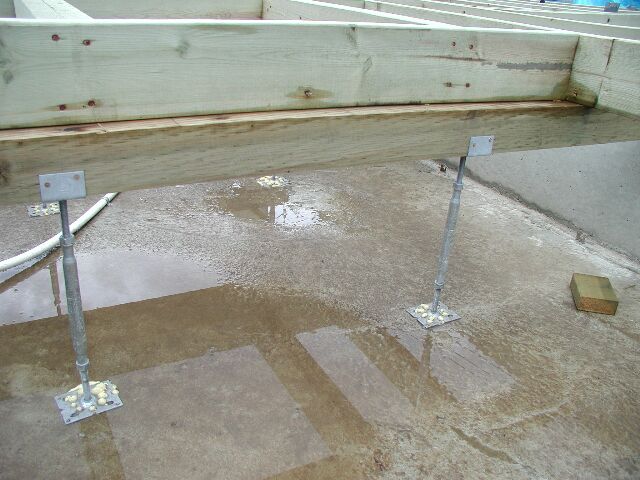 2001:09:09 13:36:52 雨が降って水がたまっています。ちょっと心配。大引き(横棒)をささえているの金属の棒は束と言うそうです。以前は束は材木でしたが、最近は金属のものが使われるようです。真ん中のねじで高さを調節できるそうです。大引きが乾燥して縮んだとき、高さを上げて床鳴りを防ぐのです。