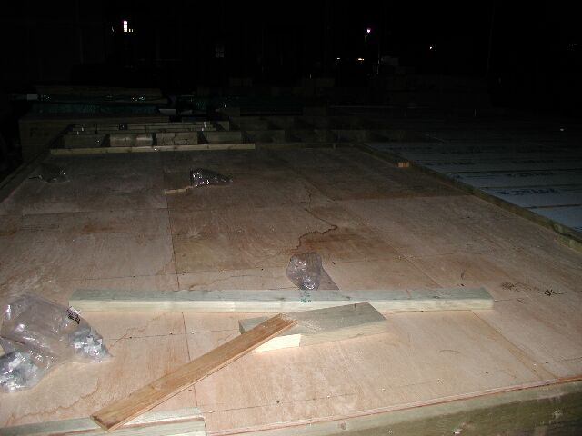 2001:09:12 18:36:23 和室の床が張られてます。雨に濡れてシミになっているのが、ちょっと残念ですが、ツーバイフォーの宿命です。この先雨があまり降らないことを祈るのみです。