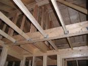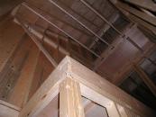 2001:09:30 16:59:40 二階天井になるところです。金物を使って木材を留めています。金物の使用は基準があり、不足してはいけないのですが、素人の私にはこれが十分なのかそうでないのかは分かりません。大工さんを信じるしかないです。 |