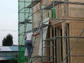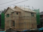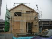 2001:09:30 17:04:29 家の形がほぼできあがりました。「こうなるとうれしいですね」と大工さんに話しかけましたが、反応はありませんでした。(シャイな大工さんなんです) |