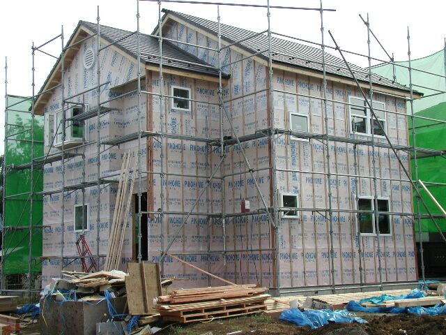 家の周りに防水のための特殊な紙を貼っています。不動産会社の名前と電話番号が書かれてます。